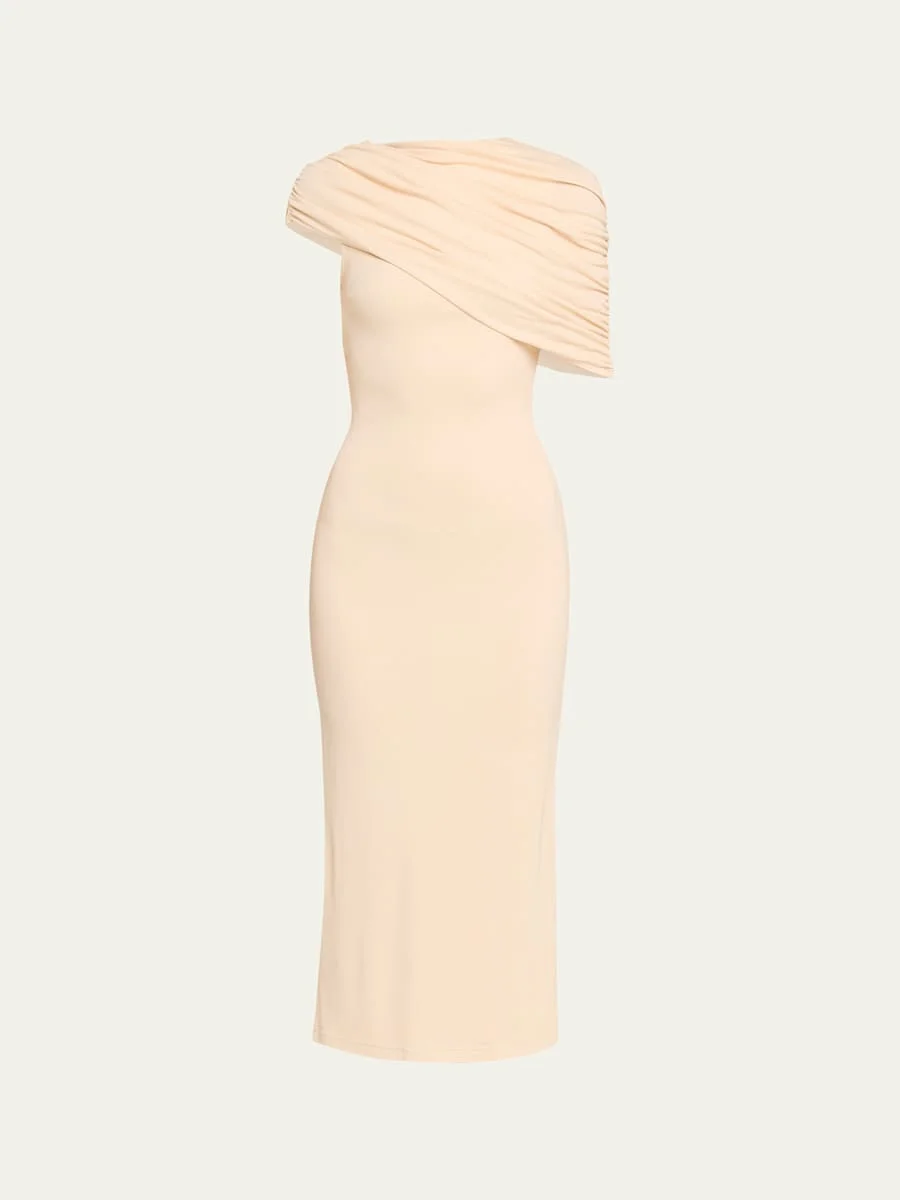 The "Bonachi" midi dress by ESSE Studios features an asymmetric cape bodice and is crafted from stretch jersey for an elegant look without compromising comfort. High neckline Asymmetric sleeves Figure-hugging silhouette Center back vent Invisible back zip Viscose Unlined Hand wash Made in Australia Online Inquiries: BGS21_T6VY1| Store Inquiries: #5046765