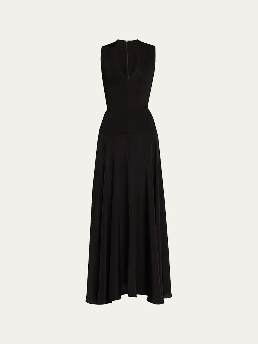 A signature ESSE Studios silhouette, the "Illi V" maxi dress features a sculpted V-neck bodice and is finished with a flowing silk skirt. Plunging neckline Sleeveless Drop-waist silhouette Full length Center back zip Viscose/silk Unlined Dry clean Made in Australia Online Inquiries: BGS21_T6VXW| Store Inquiries: #5046760