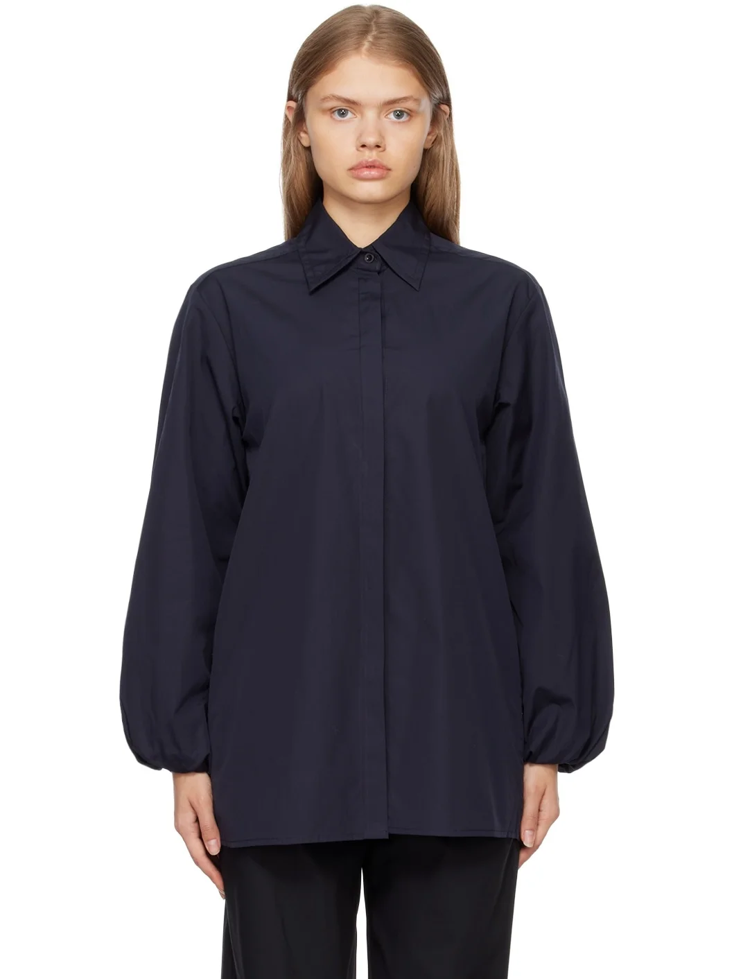 Organic cotton-blend poplin shirt. · Spread collar · Concealed button closure · Elasticized cuffs · Box pleat at back Supplier color: French navy 50% organic cotton, 50% cotton. Made in Australia 222475F109002