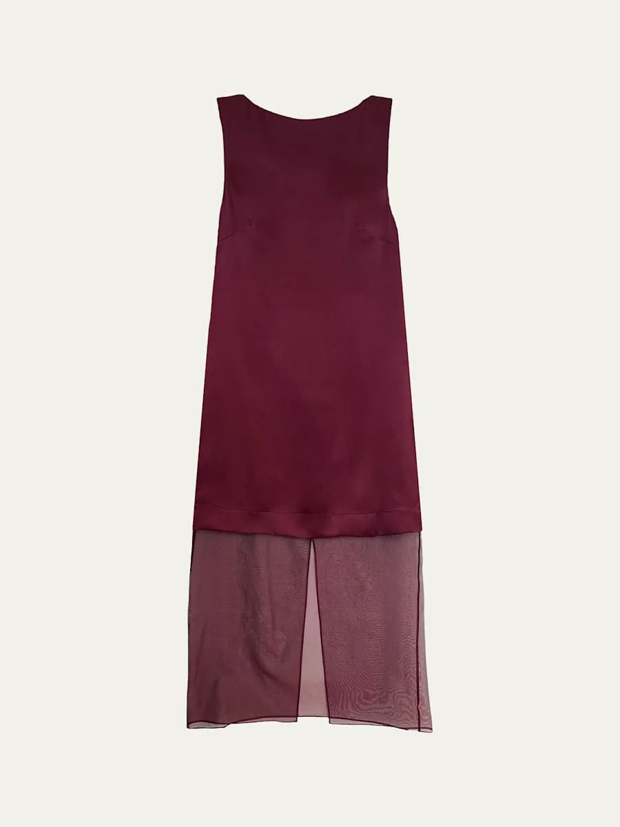 Featuring a sheer organza overlay and elegant draping, the "Rio" dress by ESSE Studios is cut from silk satin for a sleek yet romantic silhouette. Boat neckline Sleeveless Column silhouette Center back vent Back keyhole closure Silk Dry clean Made in Australia Online Inquiries: BGS21_T8SEM| Store Inquiries: #5405254