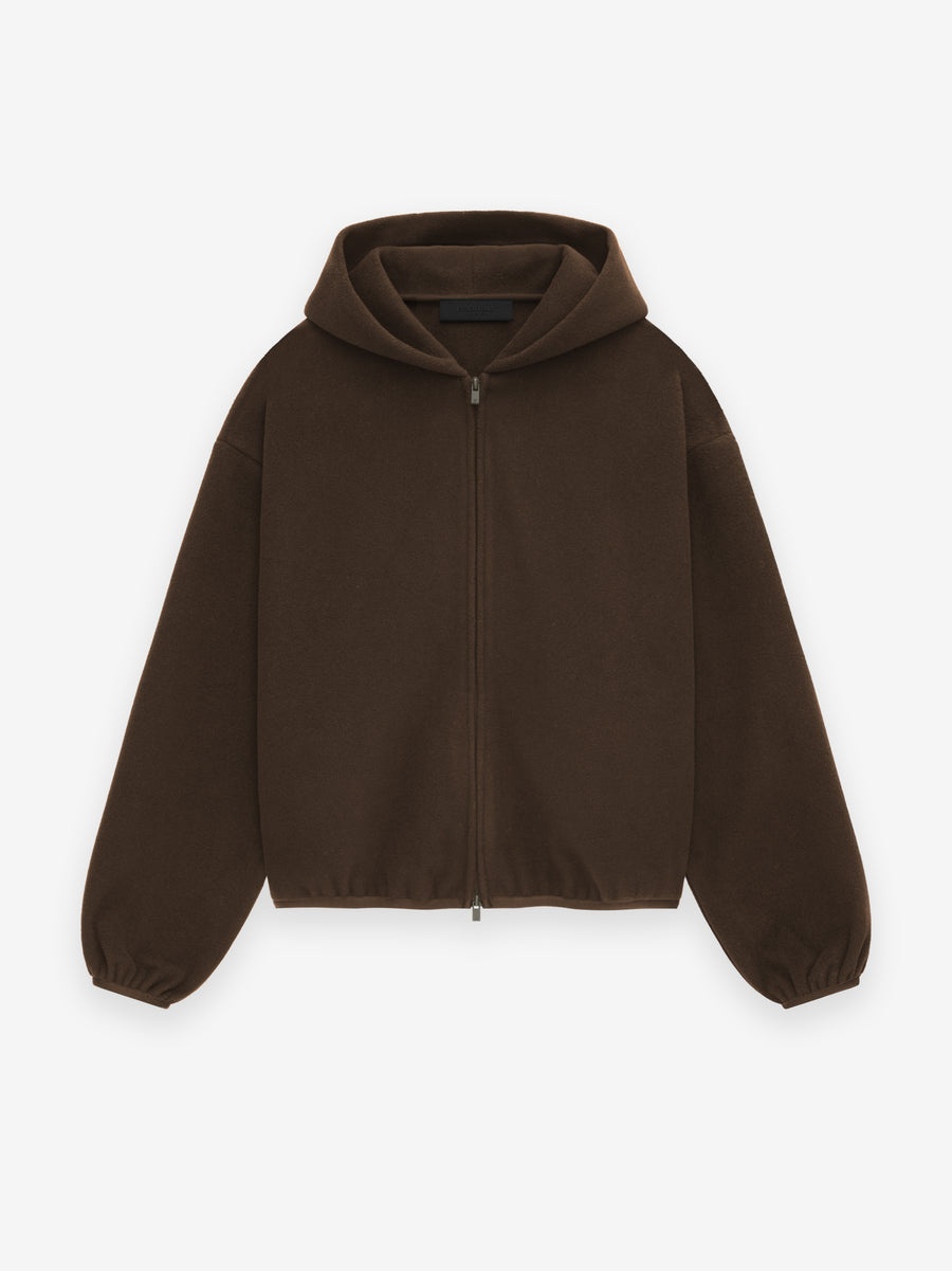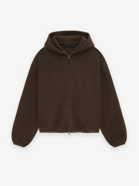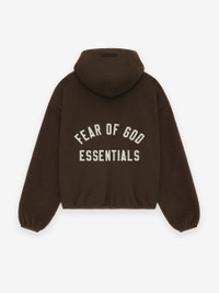 The Women's Brushed Hooded Bomber is constructed in a heavyweight, soft brushed yarn to provide warmth, comfort, and structure. The Women's fit is cropped, and relaxed in the body. The collegiate Fear of God Essentials logo is applied in satin twill lettering. Functional details include a front half zipper, side seam pockets, and elastic binding on the sleeve, and waist hem. DETAILS - 88% poly / 12% viscose - Women's cropped, relaxed fit - Fear of God Essentials satin twill lettering - Full zip front - Sleeve and Waist Hem with elastic binding - Side seam - Imported