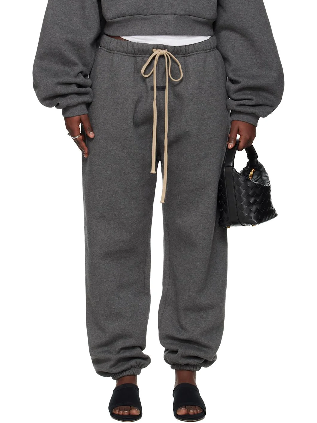 Cotton-blend fleece lounge pants. · Drawstring at elasticized waistband · Two-pocket styling · Rubber logo patch at front · Elasticized cuffs Part of the Fear of God ESSENTIALS Holiday collection. Supplier color: Charcoal heather 80% cotton, 20% polyester. Made in Viet Nam 261161F086010