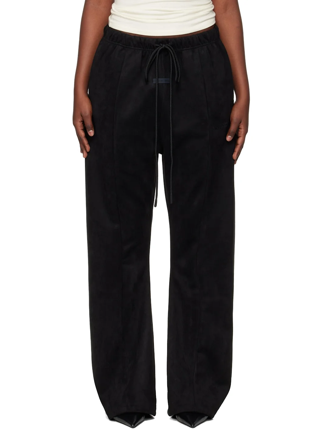 Stretch faux-suede lounge pants. · Drawstring at elasticized waistband · Two-pocket styling · Rubber logo patch at front · Logo bonded at front · Flared cuffs · Jersey lining Part of the Fear of God ESSENTIALS Holiday collection. Supplier color: Vintage black 92% polyester, 8% spandex. Made in Viet Nam 261161F086005