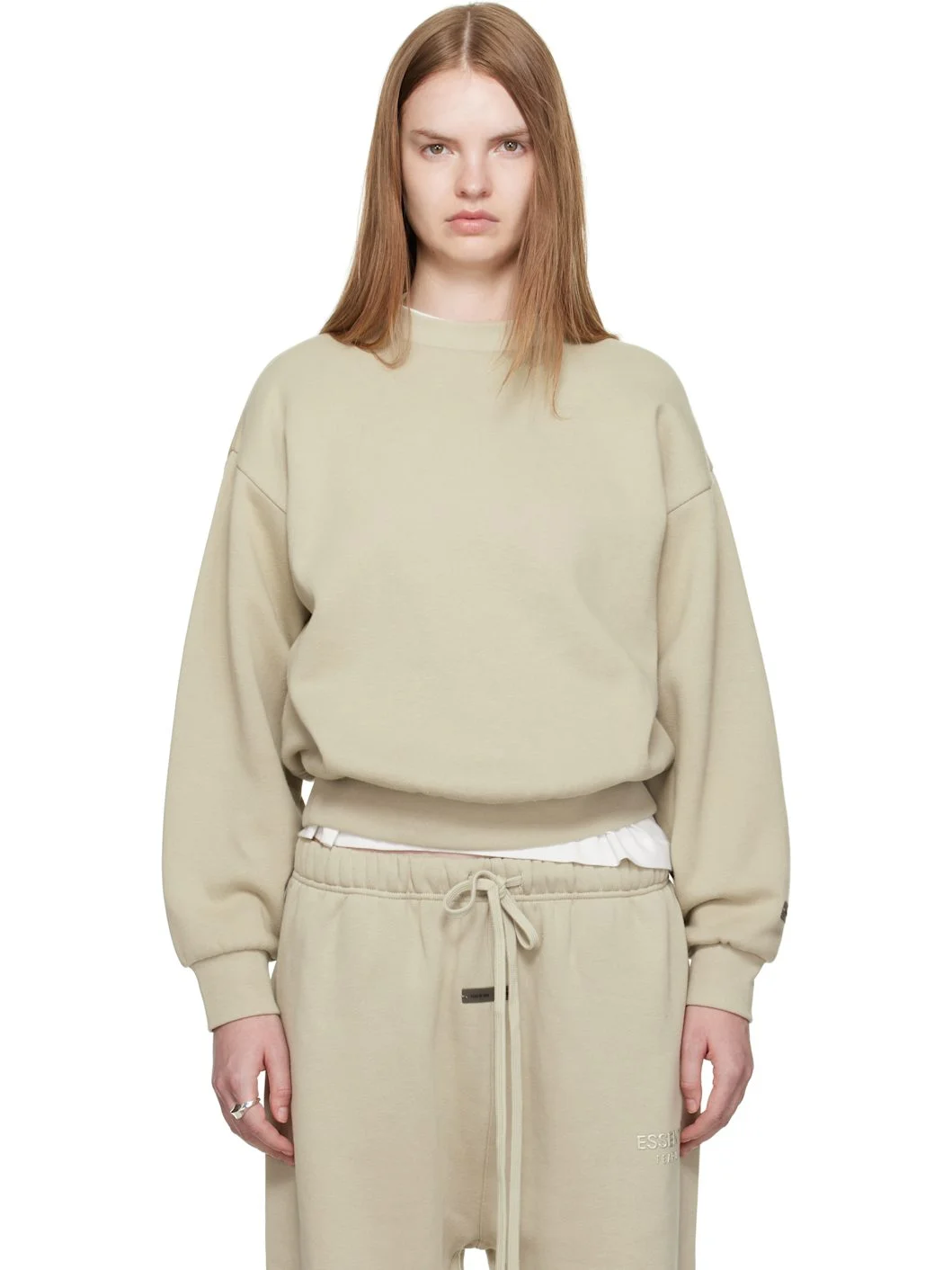 Cotton-blend fleece sweatshirt. · Rib-knit crewneck, hem, and cuffs · Dropped shoulders · Rubber logo patch at cuff and back collar · Bonded logo at back Supplier color: Abbey stone 80% cotton, 20% polyester. Made in Viet Nam 252161F098003