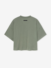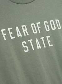 The Womens Boxy Tee is crafted from a soft tri-blend jersey for an enhanced feel. It features a rib-knit crewneck and a loose fit throughout the body, along with drop shoulders for a stylish drape. Branding includes a screen-printed "Fear of God State" logo on the front and Fear of God Essentials rubberized label at the collar. DETAILS - " - 53% cotton, 40% polyester, 7% rayon jersey knit, 200gsm - Womens Boxy fit - loose fit, drop shoulder - "Fear of God State" screen-printed logo - Rib-knit crewneck - "Fear of God Essentials" translucent rubberized label - Imported