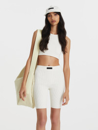 The Essentials biker short is made in a soft cotton blend with a performance rib texture that comfortably contours around the body. The biker short is the ideal stand-alone or layering piece. A rib-knit elastic waistband is detailed with a new Fear of God rubberized label. Model is 5'9" and wears size Small. DETAILS - 43% cotton, 29% polyester, 28% nylon rib-knit - Rib-knit elastic waistband - Fear of God rubberized label at the center, front waistband - Imported
