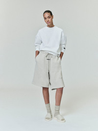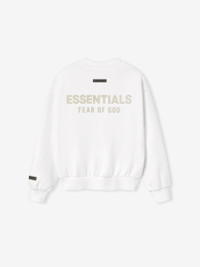 The Womens Classic Crewneck is crafted from 380gsm core fleece, which offers both body and structure to a relaxed silhouette with a cropped length. A new beveled metallic "Essentials Fear of God" logo is prominently displayed on the back. Additional details include a rib-knit crewneck, cuffs, and waist hem. A "Fear of God Essentials" rubberized label is stitched onto the sleeve. DETAILS - 80% cotton / 20% polyester fleece, 380GSM - Model is 5'11" and wears size Small in Cloud White - Womens Essentials fit - relaxed, cropped fit - "Essentials Fear of God" beveled metallic logo - Rib-knit crewneck, cuffs, waist hem - "Fear of God Essentials" translucent rubberized label - Imported