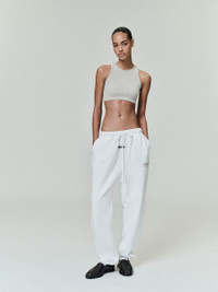 The Womens Classic Sweatpant is crafted from 380gsm core fleece, offering both body and structure. The classic fit has a rounded silhouette with a relaxed leg that tapers to an elastic cuff. A new "Essentials Fear of God" beveled metallic logo is prominently branded on the leg. Additional details include an encased elastic waistband, elongated drawstrings, side seam pockets, and ankle bungee. Additionally, there is a "Fear of God Essentials" translucent rubberized label positioned at the center front.