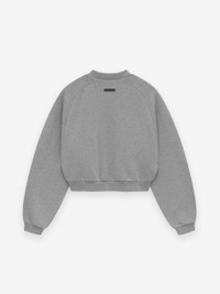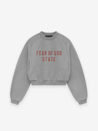 The Womens Essentials Fleece Crewneck is made in a heavy 480gsm core fleece to provide additional body and structure to its cropped, boxy silhouette. A "Fear of God State" collegiate graphic is screen printed on the front. Details include a rib-knit collar, cuffs, and waist-hem. The Essentials Fear of God rubberized label is at the back collar. DETAILS - 80% cotton / 20% polyester fleece, 480GSM - Womens Essentials fit - cropped, boxy - "Fear of God State" screen print - Rib-knit collar, cuffs, and waist hem - Essentials Fear of God rubberized label - Imported