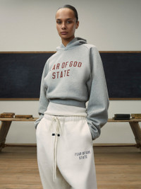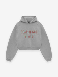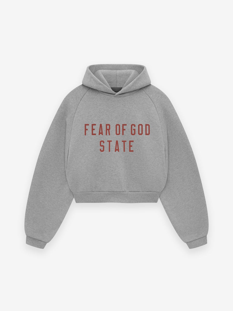 The Womens Essentials Fleece Hoodie is made in a heavy 480gsm core fleece to provide additional body and structure to its round, cropped silhouette. Collegiate-inspired "Fear of God State" is screen printed on the front. Details include an overlapped neckline hoodie, rib-knit cuffs, and waist-hem. The Essentials Fear of God rubberized label is on the hood. DETAILS - 80% cotton / 20% polyester fleece, 480GSM - Womens Essentials fit - cropped fit - "Fear of God State" screen print - Overlapped neckline hoodie - Rib-knit cuffs, and waist hem - Essentials Fear of God rubberized label - Imported