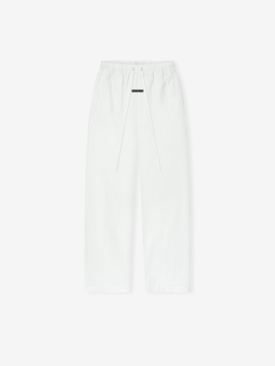 The Womens Relaxed Pant is crafted from 100% cotton Oxford cloth for lightweight comfort. The relaxed straight leg fit highlights fabric drape and movement. Additional details include an encased elastic waistband and bottom hem, elongated drawstrings, and side seam pockets. Additionally, there is a Fear of God Essentials rubberized label positioned at the center front. DETAILS - 100% cotton Oxford cloth - Womens Relaxed fit - relaxed straight leg - Encased elastic waistband - Heavyweight drawstring with rubberized tip - Side seam pockets - "Fear of God Essentials" translucent rubberized label - Imported