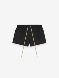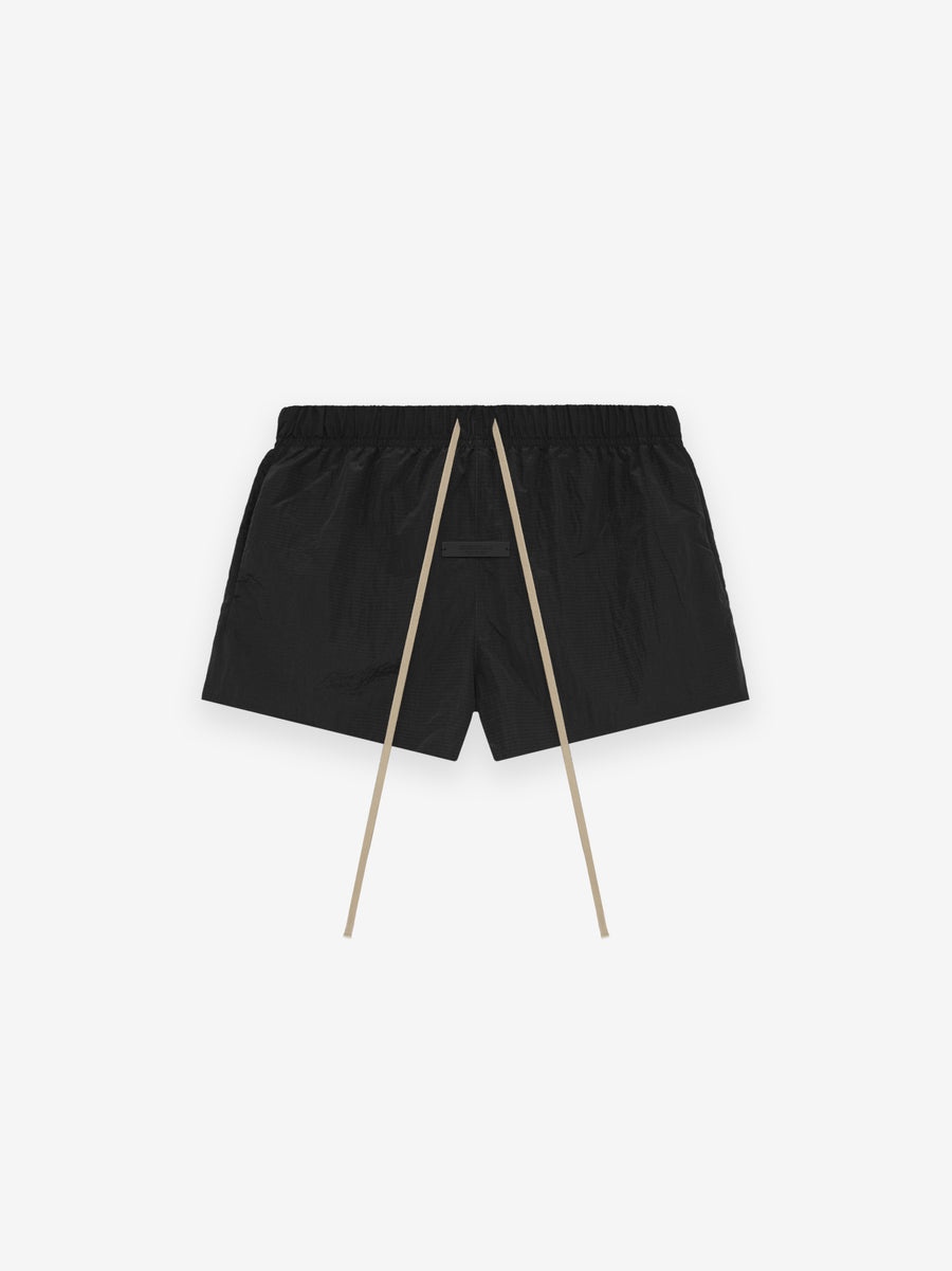 The Womens Ripstop Running Short is constructed with durable nylon ripstop for a textured, water-repellent finish. The women's fit is cropped with wide leg openings and a curved hemline. Details include a perforated poly lining, an encased elastic waistband, elongated drawstring, and side pockets.. Minimalist branding is showcased with the Essentials Fear of God black bar at the center front. DETAILS - 100% ripstop nylon - 100% polyester perforated lining - Womens Essentials fit, cropped - Curved hemline - Encased elastic waistband - Heavyweight drawstring with rubberized tip - Side pockets - Essentials Fear of God rubberized label - Imported
