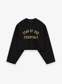 The Women's Essentials Long Sleeve Tee is made of a tri-blend jersey for a softer feel. It features a rib-knit crewneck and a cropped, boxy silhouette with flared sleeves to highlight drape . The front is branded with a "Fear of God Essentials " collegiate graphic screen print, and the back collar has a stitched Essentials Fear of God rubberized label. DETAILS - 53% cotton, 40% polyester, 7% rayon jersey knit, 200gsm - Womens boxy, cropped fit with flared sleeves - "Fear of God Essentials" screen print - Rib-knit crewneck - Essentials Fear of God rubberized label - Imported