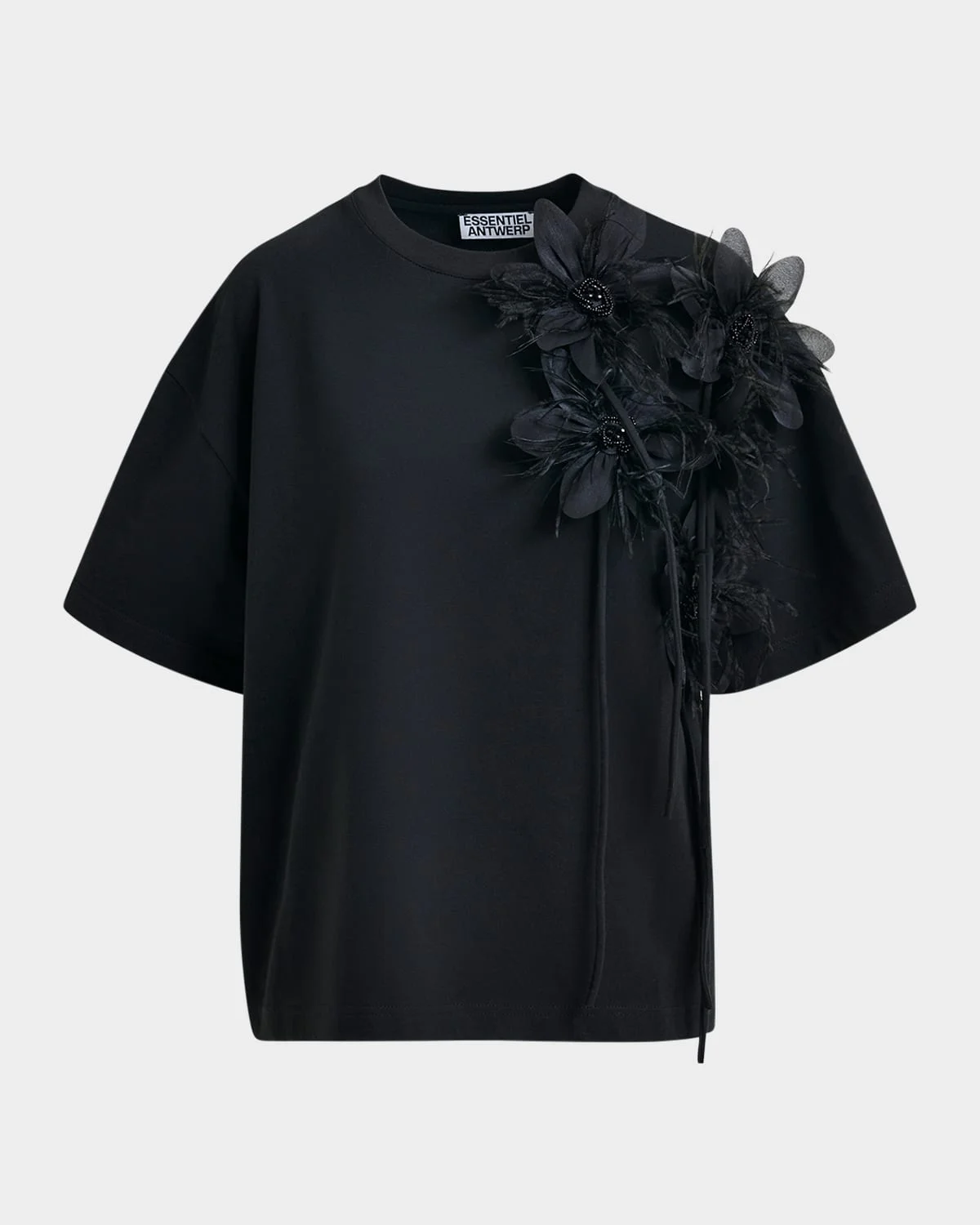 Embellished with a statementmaking arrangement of floral appliques made from delicate feathers and beads, the "Ibiscus" tshirt by Essentiel Antwerp offers an elevated, dimensional take on the classic silhouette Approx. 25.8"L from shoulder to hem Crew neckline Short sleeves; approx. 8.3"L Relaxed fit Hip length Pullover style Cotton Imported