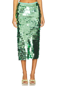 - Self 1: 100% polyester Self 2: 100% polyethylene terephthalate Lining: 100% viscose - Hand wash cold - Fully lined - Hidden side zipper closure - Sequin embellished fabric with side slit - Waist to shortest hem measures approx 16" and to longest hem approx 35" in length - Revolve Style No. ESSE-WQ23 - Manufacturer Style No. Ihoed