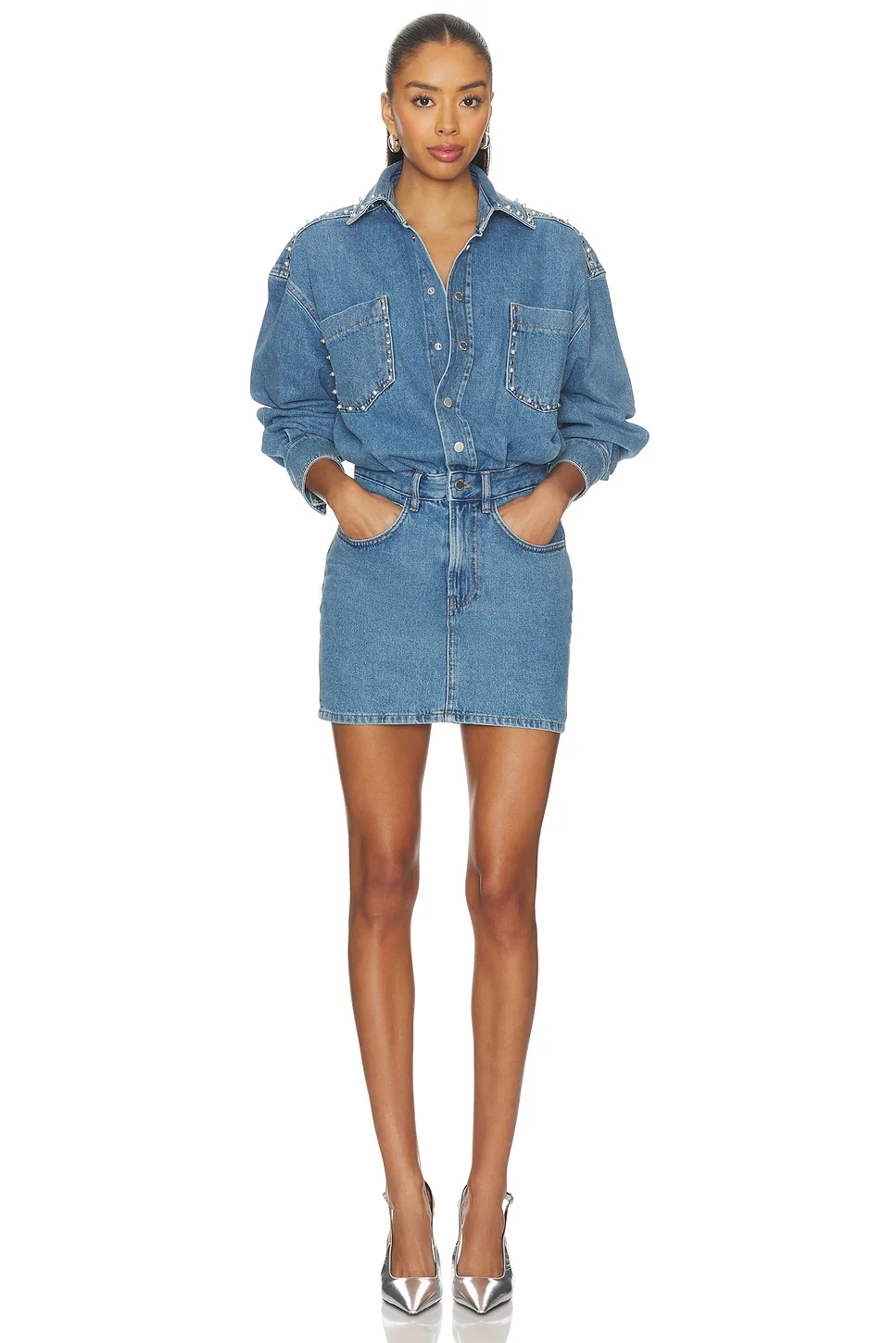 - 100% cotton - Made in Turkey - Machine wash - Unlined - Partial front button closure and zip fly - Pearlized embellishment - Front breast pockets five pocket styling - Revolve Style No. ESSE-WD62 - Manufacturer Style No. Ilene