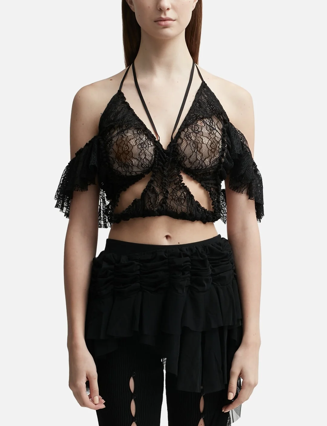 - ESTER MANAS - Butterfly Top - Slim fit - Off-shoulder sleeves - V-neckline - Cropped cut - Semi-sheer lace fabric - Cut-out details - Ruching throughout - Color: Black - Material: 95% Polyester, 5% Elastane - See more Tops and Clothing SIZING - Model wears Free Size - Model measures: Height 181cm, Chest 33”/84cm, Waist 24”/61cm, Hip 35”/90cm