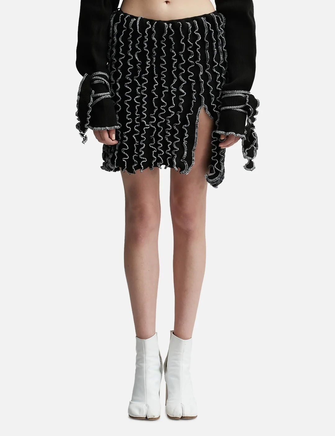 - ESTER MANAS - Mini Curly Skirt - Above-knee length - Elasticated waist - Self-tie fastening - Rib-knit - All-over pleating - Contrast top-stitching - Side slit - Color: Black - Material: 95% Cotton, 5% Elastane - See more Skirts and Clothing SIZING - Model wears Free Size - Model measures: Height 181cm, Chest 33”/84cm, Waist 24”/61cm, Hip 35”/90cm