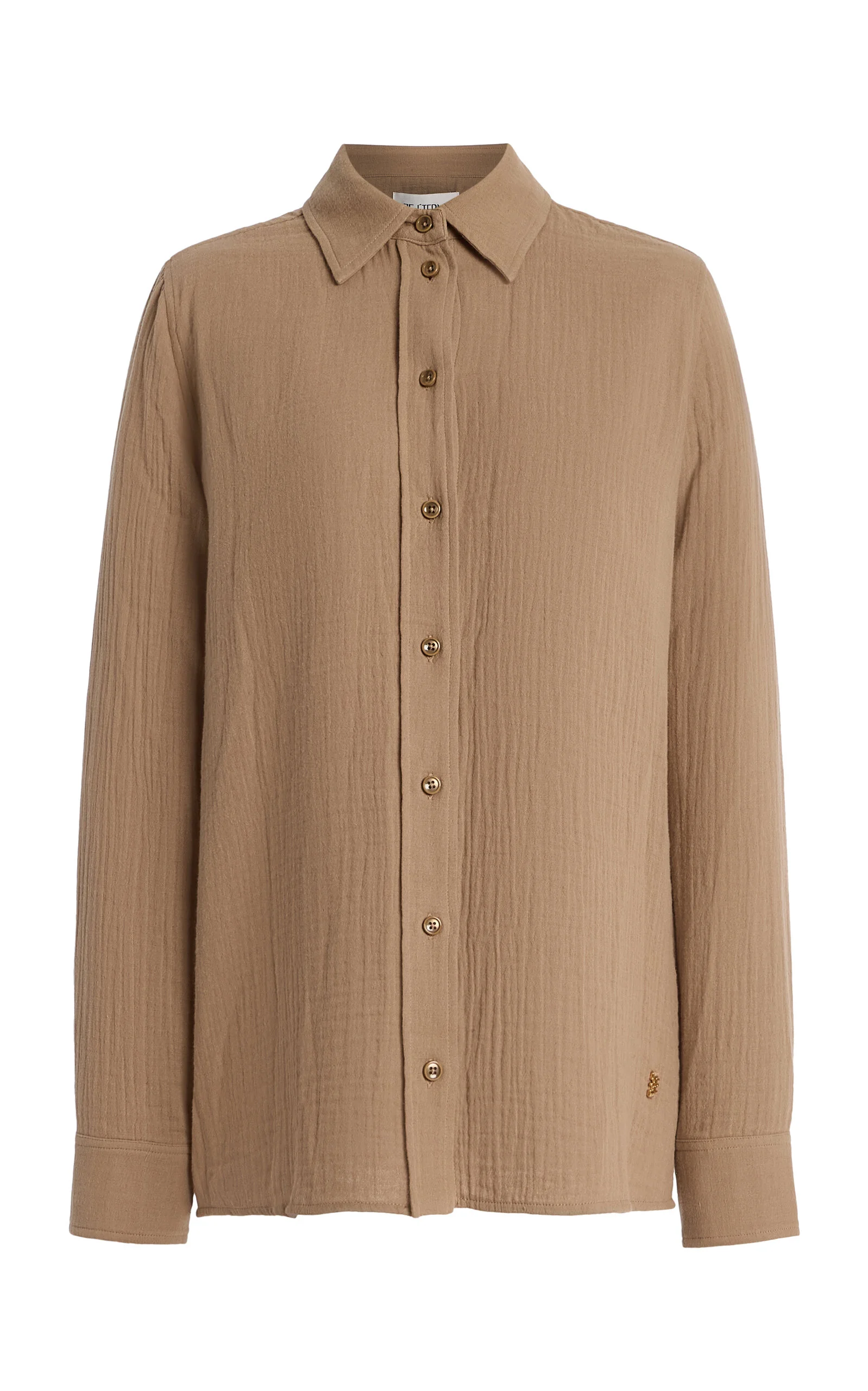 Founded by stylist Chloe Bartoli, Eterne specializes in elevated wardrobe essentials created with exquisite craftsmanship and their brand of muted luxury. The 'Constance' shirt is crafted from silicone-washed cotton gauze that's lightweight, breathable. It offers a relaxed fit and a classic feel—designed to be your summer staple. Wear it over a swimsuit with the matching pant. PRODUCT DETAILS - Pre-Fall '25 - Button fastening - Composition: 100% cotton w/ silicone wash - Dry clean - Made in the USA SIZE & FIT - Our model is wearing a size Small - Model is 5'10" with a 31" bust, 23.5" waist, and 33.5" hip - Designed for a regular fit