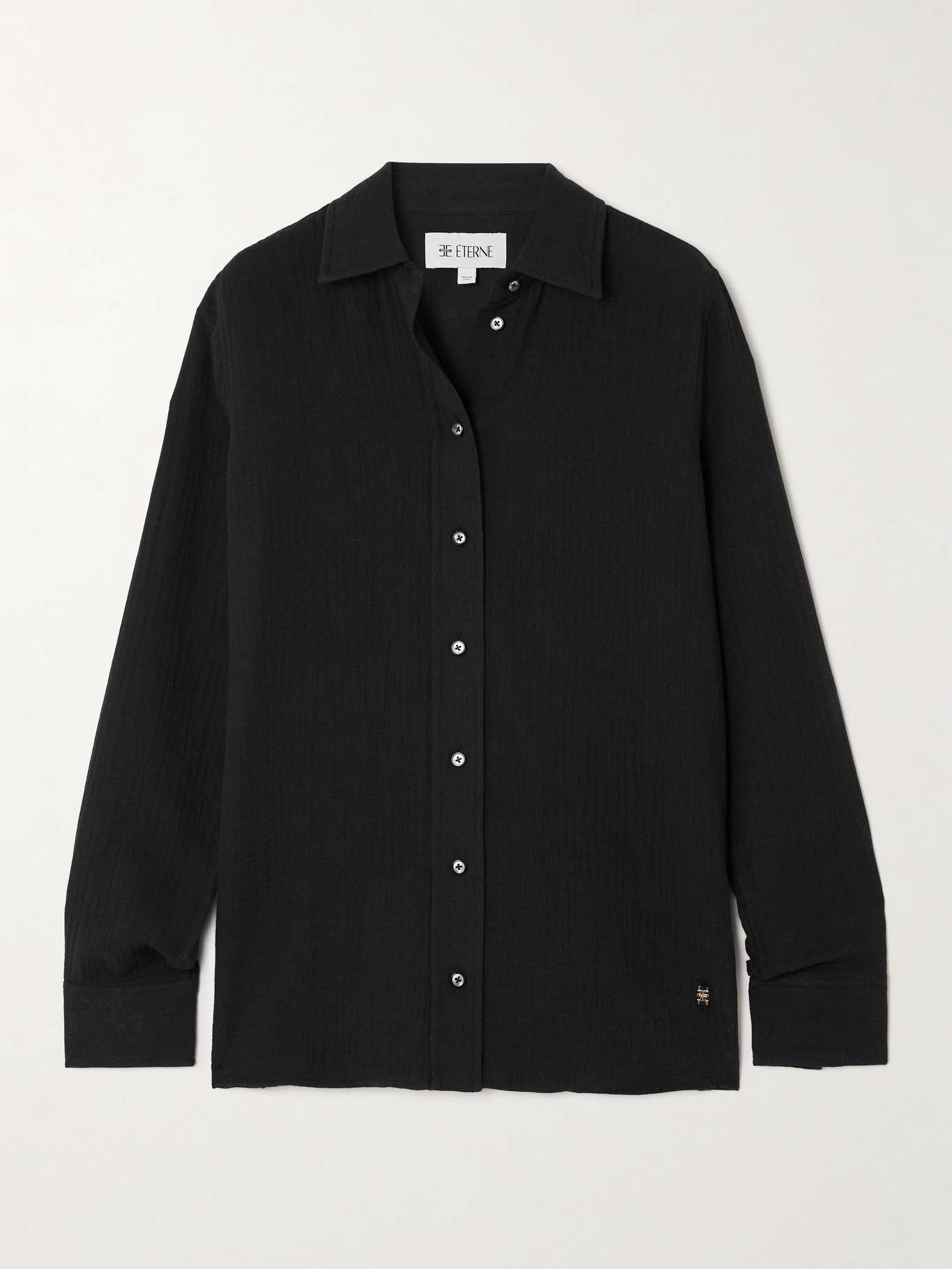 EDITORS'NOTES Effortlessly chic and comfortable, Eterne's 'Constance' shirt is cut for a relaxed fit from airy cotton-gauze. It fastens with lustrous buttons and has a neat collar. Wear yours with the matching shorts and roll the cuffs for a laid-back take. SIZE & FIT Model measurements: - Fits true to size, take your normal size - Designed for a relaxed fit - Mid-weight, slightly stretchy fabric - Model is 177cm/ 5'10" and is wearing a size Small - Bust: 81cm/ 32" - Waist: 62cm/ 24.5" - Hip: 89cm/ 35" DETAILS & CARE - Black cotton-gauze - Button fastenings through front - 100% cotton - Machine wash