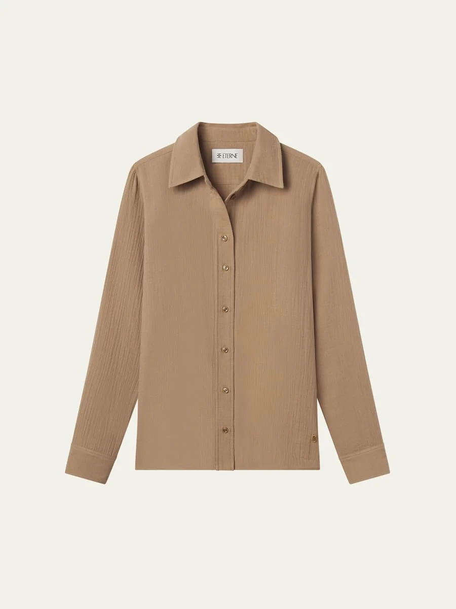 Crafted from breathable gauze, the Constance top by Eterne offers a comfortable, classic fit Shirt collar; button front Long sleeves; button cuffs Relaxed fit Hip length Cotton Made in USA Online Inquiries: BGS21_T6VUN| Store Inquiries: #5045677