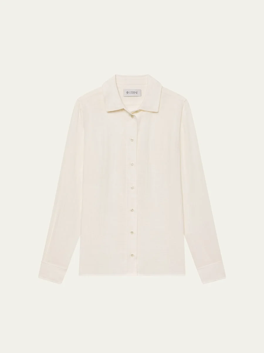 Crafted from breathable gauze, the Constance top by Eterne offers a comfortable, classic fit Shirt collar; button front Long sleeves; button cuffs Relaxed fit Hip length Cotton Made in USA Online Inquiries: BGS21_T6VUN| Store Inquiries: #5045677