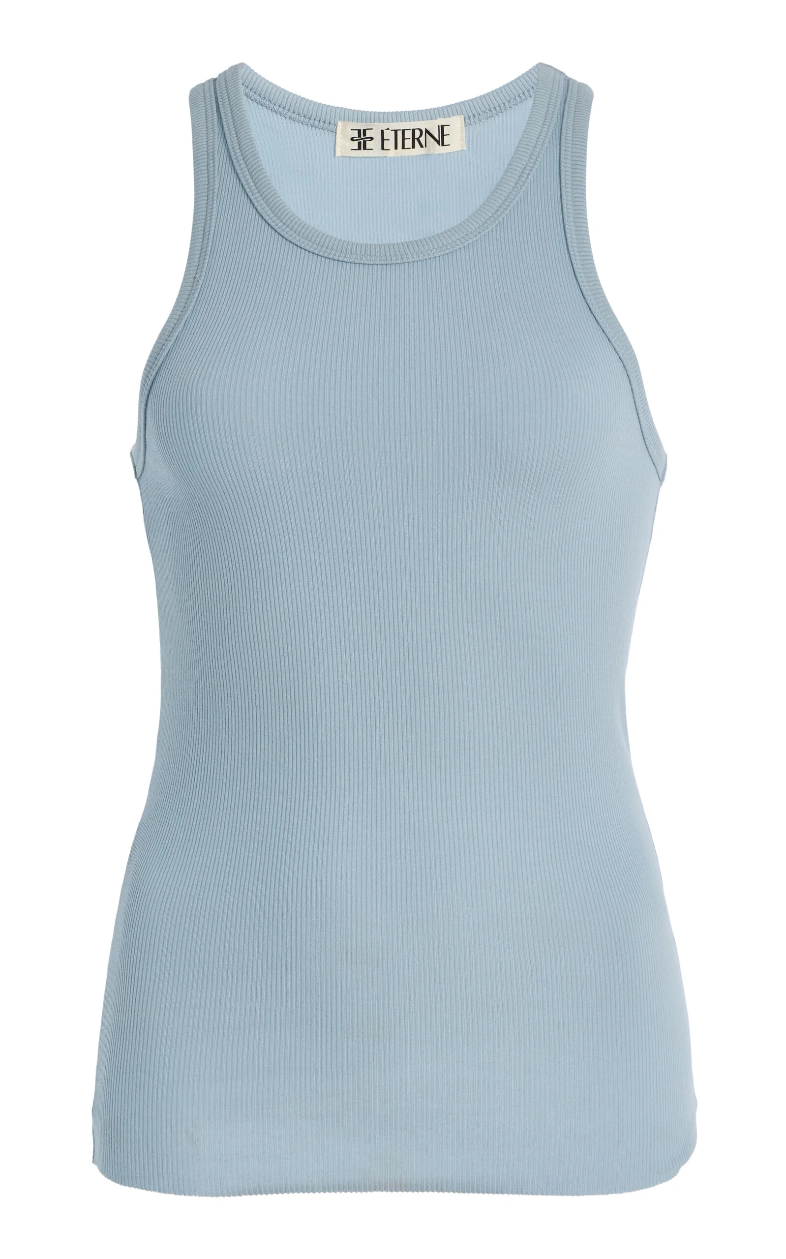 Founded by stylist Chloe Bartoli, Eterne specializes in elevated wardrobe essentials created with exquisite craftsmanship and their brand of muted luxury. This high neck fitted tank is crafted from butter soft ribbed cotton and modal blend, offering a slim fit and a full length—a versatile essential for everyday wear. PRODUCT DETAILS - Pre-Fall '25 - Slip on - Composition: 48% cotton, 48% modal, 4% spandex - Designer color: Dusty Blue - Machine wash - Imported SIZE & FIT - Our model is wearing a size Small - Model is 5'10" with a 30" bust, 24" waist, and 34" hip - Designed for a slim fit