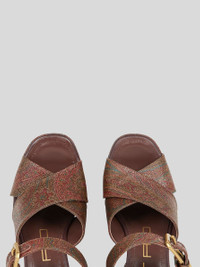 Platform sandals in iconic Paisley jacquard fabric. This accessory features criss-crossing front bands, an ankle strap with custom buckle and the Etro logo printed on the insole. • Heel height: 3.9 inches (10 cm) • Ankle-strap closure • Made in Italy PRODUCT DETAILS • Exterior: Paisley jacquard cotton fabric coated with matt texture and lined with canvas • Coating: 100% PVC • Insole: 100% cowhide • Lining: 100% cowhide • Sole: 100% cowhide • Buckle: 100% brass
