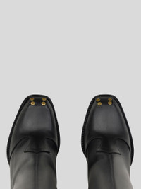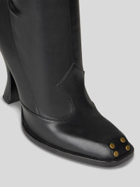 Knee-length boots with leather upper and snug leg shaft. This model, presented at the Autumn-Winter 25 Runway Show, is embellished with four flat gold-finish studs at the toe and is complete with a slightly curved high heel. • Heel height: 4.1 inches (10.5 cm) • Rear zip closure • Made in Italy PRODUCT DETAILS • Upper: 100% calfskin • Leg: 60% polyurethane, 40% polyester • Sole: 100% cowhide • Appliques: 100% brass