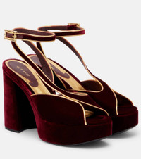 Italian glamour manifested: Etro's brand DNA revels in color, fabric, and an immutable sense of elegance. Made from burgundy-hued velvet with golden trims, these platform sandals rest atop thick 120mm heels and a distinct asymmetrical strap design. Product Details - Upper: velvet - Lining: leather - Sole: leather insole, leather and rubber sole - Toe shape: round open toe - Made in Italy - Includes: shoe box - Designer color name: Bordeaux - Item color: burgundy - Hardware color: gold - Closure: buckle-fastening ankle strap - Item number: P01119049 Size & Fit - True to size - Half sizes please take the next size up - European sizes - 12cm-4.5" heel (size EU 38) - 4cm-1.5" platform (size EU 38)
