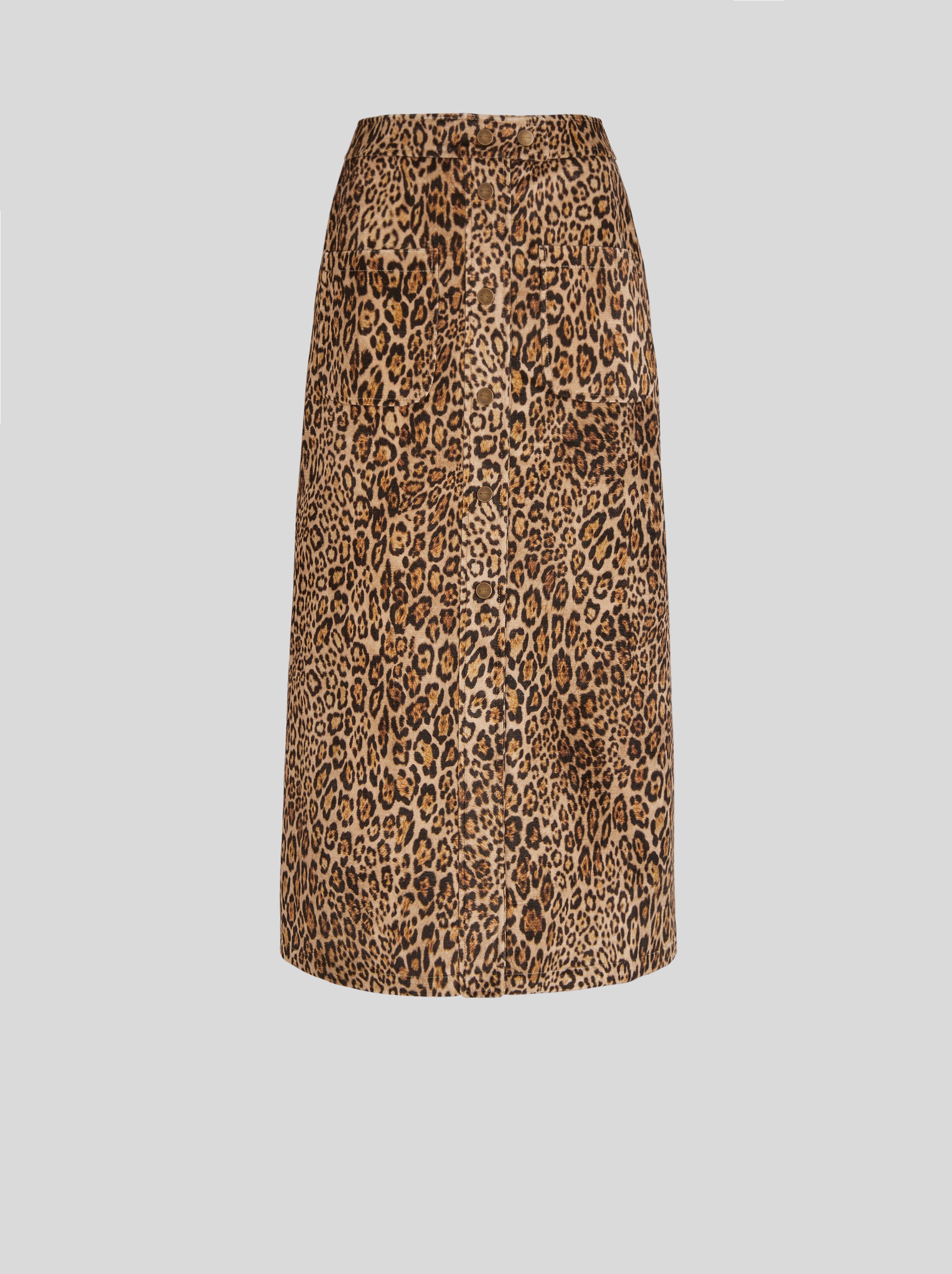 Midi skirt from the Women's Fall-Winter 2022 fashion show collection, embellished by an all-over animalier print and buttons with ETRO logo. PRODUCT DETAILS • Exterior: 55% cotton, 45% viscose • Interior: 57% viscose, 43% polyester • Regular fit • Front patch pockets • Fastening with ETRO metal buttons • Made in Italy • The model is 178 cm tall and wears size 40 Sku: 222D1325905160800