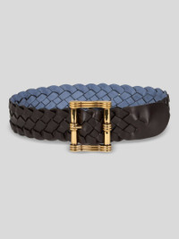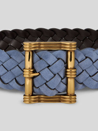 Reversible belt with one side in soft, plain-coloured leather and the other in woven suede. The accessory is enhanced by a gold-finish maxi prong buckle with stripes. • Height: 2.4 inches (6 cm) • Prong buckle • Made in Italy PRODUCT DETAILS • One side: calfskin • One side: bullskin