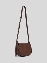 Small Drya Bag in iconic Paisley jacquard fabric. The item boasts a special construction with threading and suede inner lining against which the smooth leather slip pocket with embossed ETRO logo and Pegaso symbol stands out. The adjustable shoulder strap is finished with lacing and marbles at the end. The accessory was presented at the Spring-Summer 25 Women's Runway Show. • Dimensions (Width, Height, Depth): 8.3 x 6.7 x 2.8 inches (21 x 17 x 7 cm) • Adjustable shoulder strap • Internal patch pocket • Fastened with flap and magnetic button • Made in Italy PRODUCT DETAILS • Exterior: Paisley jacquard cotton fabric coated with matt texture and lined with canvas • Coating: 100% PVC • Detailing: calfskin • Appliques: 100% polymethylmethacrylate • Lining: calfskin