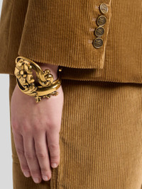 Baroque-inspired bracelet in vintage-finish brass. This accessory boasts a rounded shape and an engraved flower. • One size • Adjustable • Opening: 2.8 inches (7 cm) • Made in Italy PRODUCT DETAILS • 100% brass