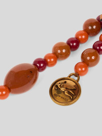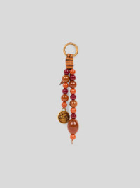 Charm consisting of a row of marbles and complete with a golden clasp ring with knotted leather. This accessory, presented at the Spring-Summer 25 Women's Runway Show, is complete with a medallion pull bearing the ETRO logo and Pegaso symbol engraved using the same technique used to mint coins. PRODUCT DETAILS • 100% polymethylmethacrylate • Detailing: calfskin • Detail: 100% cotton