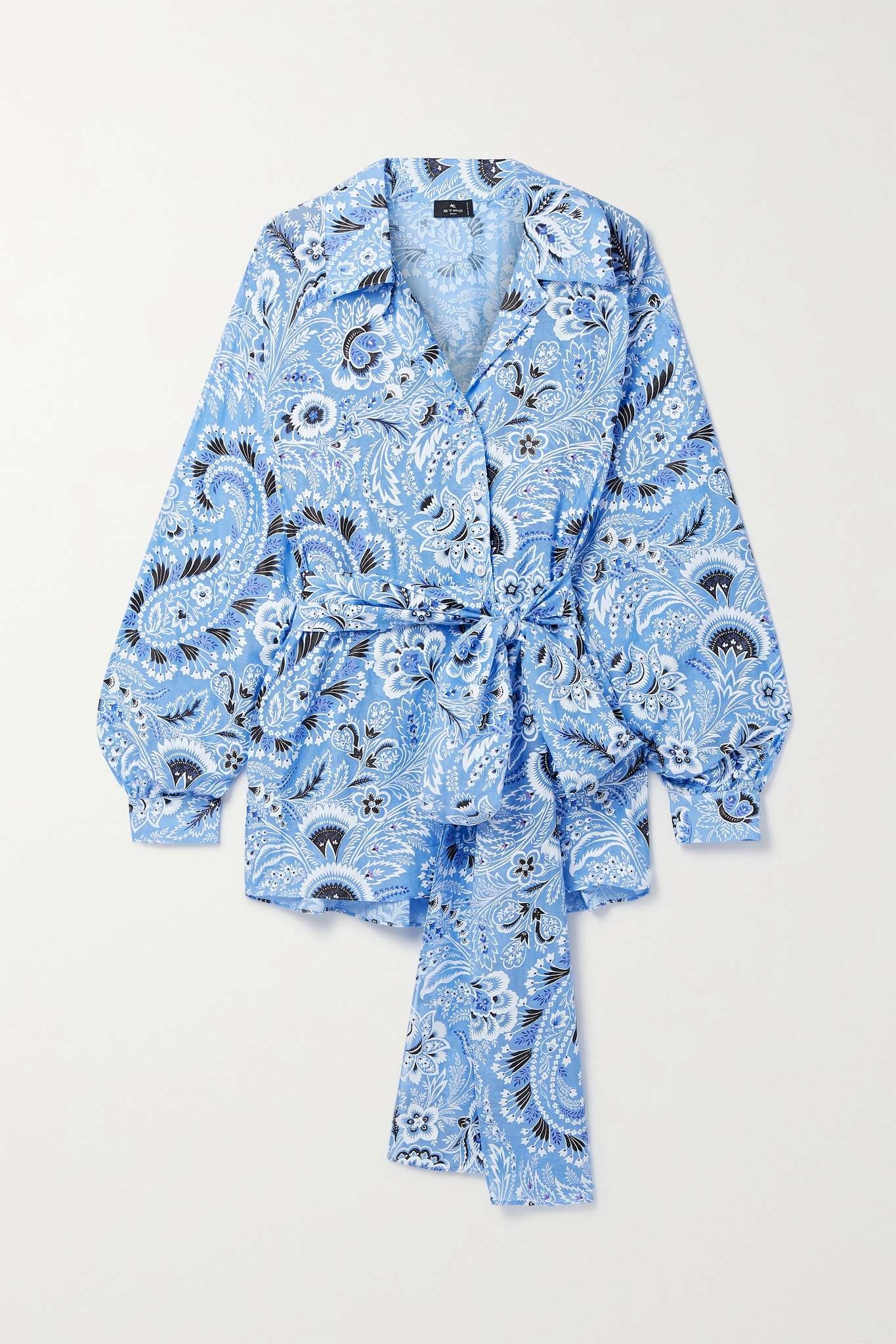 EDITORS'NOTES Etro re-imagines its signature paisley swirls with each collection. Made from vibrant cotton and silk-blend, this breezy shirt is cut in a slightly loose fit with a neat collar and billowy sleeves. The tonal belt drapes down the front, over your skirt or pants. SIZE & FIT - Fits true to size, take your normal size - Intended for a slightly loose fit, use the tie belt to cinch in at the waist - Lightweight, non-stretchy fabric - Model is 175cm/ 5'9" and is wearing an IT 40 DETAILS & CARE - Tonal-blue, white and black cotton and silk-blend - Button fastenings through front - 73% cotton, 27% silk - Hand wash - Mother-of-pearl: Indonesia