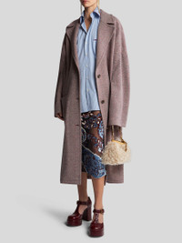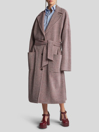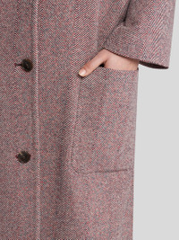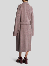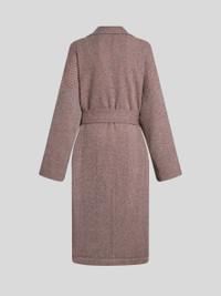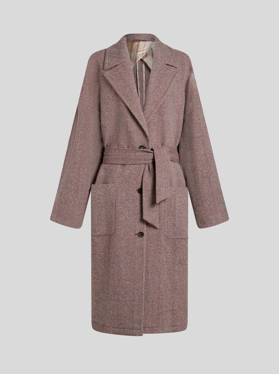 Long, relaxed-fit wool tweed coat with chevron motif and matching belt. The inner lining features a decorative striped pattern. PRODUCT DETAILS • 80% wool, 20% nylon • Details: 52% viscose, 48% acetate