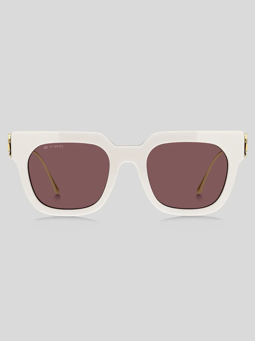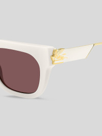 Part of the "Bold Pegaso" eyewear collection, these ETRO sunglasses for women are characterised by a unique temple design: vibrant lacquer applications add a jewel-like quality to the frames, together with a metal trim of the mythical Pegasus – a symbol of the Milanese fashion house. A quintessential representation of the brand's iconic style, these frames feature bold beveled fronts, and lasered "ETRO" lettering on the tinted lens. PRODUCT DETAILS • Frame: 100% acetate • Lenses with UVA and UVB protection • Fit: Global fit • Lenses: 1.7 inches, bridge: 0.87 inches, temples: 5.51 inches (Lenses: 43,1 mm, bridge: 22 mm, temples: 140 mm) • Made in Italy