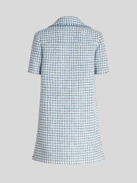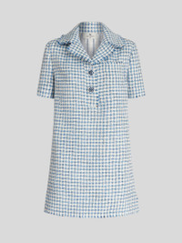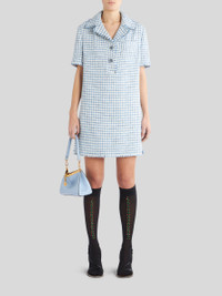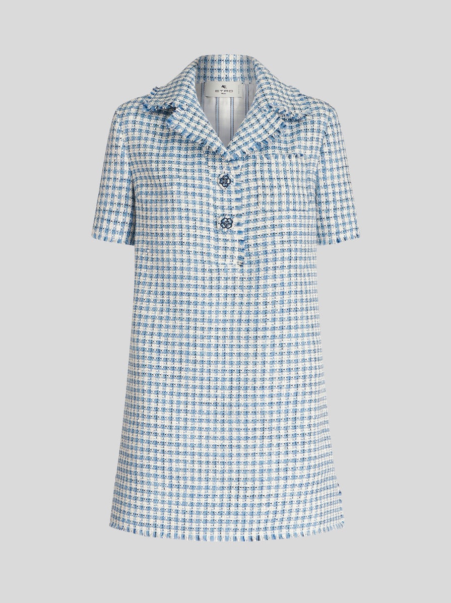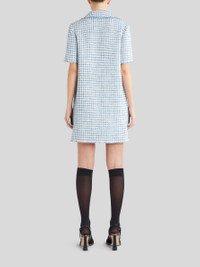 Short bouclé fabric dress with polo collar featuring buttons with floral embroidery and fringed borders. PRODUCT DETAILS • 27% virgin wool, 19% acrylic, 18% polyurethane, 15% viscose, 15% cotton, 6% polyamide • Lining: 52% viscose, 48% acetate • Straight fit • Fabric buttons • Patch breast pocket • Made in Italy • The model is 178 cm / 70 inches tall and wears size 40