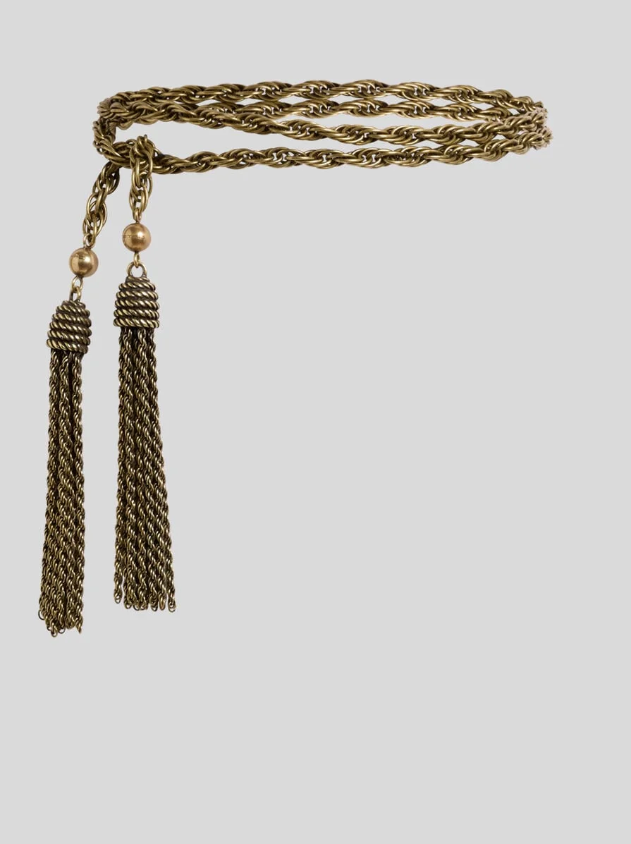 Thin belt made entirely from golden-finish metal and featuring braided links. This accessory, presented at the Spring/Summer 26 Runway Show and designed to be knotted like a fabric belt, is embellished with two metal tassels embellished with long fringes at the ends. • Total length: 72.8 inches (185 cm) • Model available in one size • Made in Italy PRODUCT DETAILS • Brass