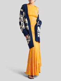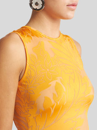 Slim-fitting, sleeveless long dress with asymmetric skirt. This item, presented at the Spring-Summer 25 Women's Runway Show, is made from stretch burnout jersey and boasts a see-through effect and scarf-inspired maxi floral print all over. The wide cut-out at the rear leaves the back open. • Slim fit • Crewneck • Sleeveless • Asymmetric skirt • Button fastening on the back • Made in Italy • The model is 5' 9½" (177 cm) tall and wears a size 40 PRODUCT DETAILS • 62% viscose, 27% polyamide, 11% elastane • Lining: 100% viscose