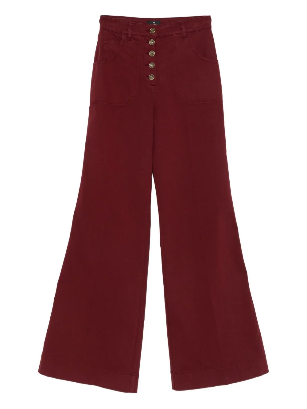 button-fly wide-leg jeans Highlights - Red - Wide leg - Button fly - Patch pockets - High waist - Straight hem Made in Italy Composition Cotton 99%, Elastane 1% SIZE & FIT Model measurements Height 5 ft 10 in(1.77 m) Bust/Chest 33.07 in(84 cm) Hips 37 in(94 cm) Waist 24.8 in(63 cm) Washing instructions Read Manufacturer Guidelines