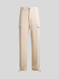 Cargo trousers in plain-coloured viscose slub fabric. This garment features patch pockets with flap and Pegaso button at the side and back, and drawstring hems whose two tips are inspired by luggage tags. The straps with eyelets and metal buckle at the back of the waist complete the design. • Regular fit • Front slant pockets • Side slip pockets and rear pockets with flap and Pegaso button • Concealed zip and Pegaso button closure • Made in Italy • The model is 5' 9½" (176 cm) tall and wears a size 40 PRODUCT DETAILS • 100% viscose