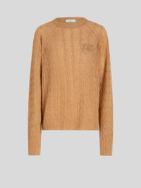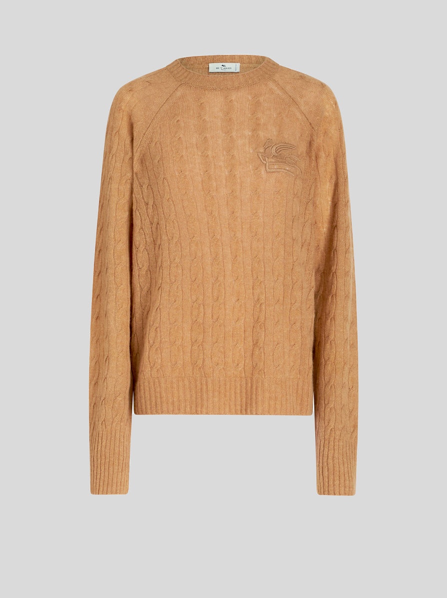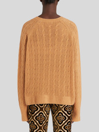 Round neck cashmere cardigan featuring cablework and decorated by ton-sur-ton embroidered ETRO logo and Pegaso. PRODUCT DETAILS • 100% cashmere • Comfort fit • Round neck • Long sleeves • Made in Italy • The model is 178 cm / 70 inches tall and wears size 40