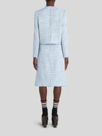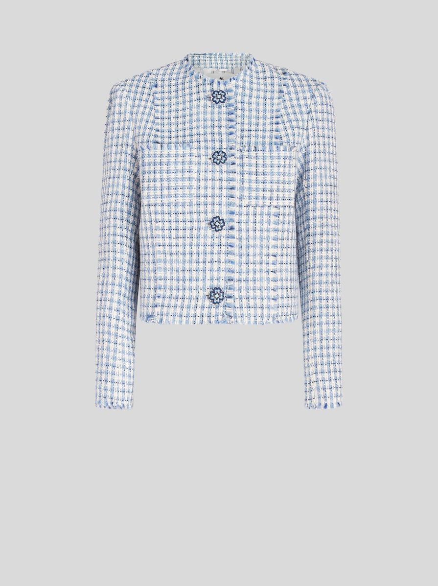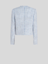 Cropped single-breasted check bouclé fabric jacket featuring buttons with floral embroidery and striped lining on the inside. PRODUCT DETAILS • Exterior: 27% virgin wool, 19% acrylic, 18% polyurethane, 15% viscose, 15% cotton, 6% polyamide • Lining: 52% viscose, 48% acetate • Boxy fit • Round neck • Single-breasted fastening • Fabric buttons • Front patch pockets • Made in Italy • The model is 178 cm / 70 inches tall and wears size 40