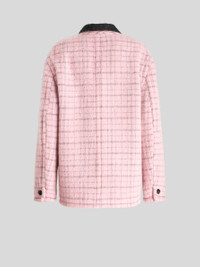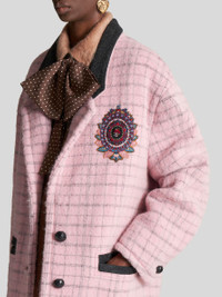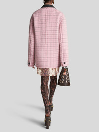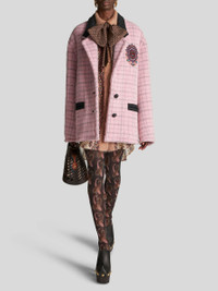 Virgin wool and brushed mohair jacket from the Women's Fall-Winter 2023 Fashion Show collection, featuring a velvet collar, contrasting details and decorated by check patterns and placed floral embroidery. Inside, the jacket has a striped logoed lining. PRODUCT DETAILS • Exterior check fabric: 58% virgin wool, 14% alpaca, 14% mohair, 14% polyamide • Collar: 57% polyester, 39% acrylic, 4% wool • Embroidery: 100% polyester • Lining: 52% viscose, 48% acetate • Oversize • Peak lapels • Woven leather button fastening • Piped pockets • Made in Italy • The model is 178 cm / 70,07 inches tall and wears size 40