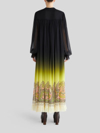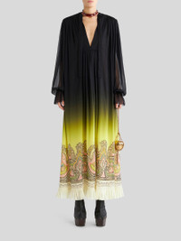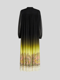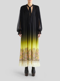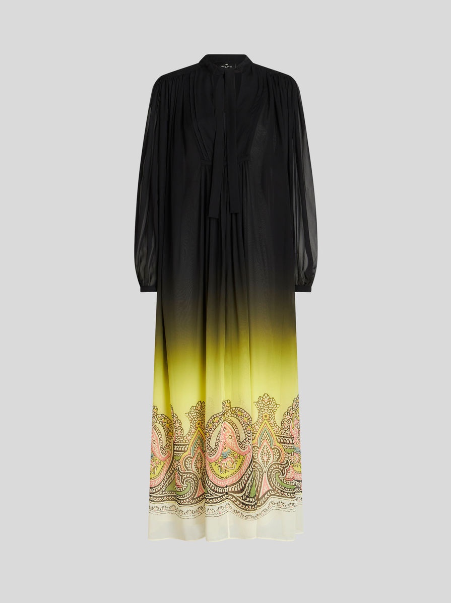 Long dress in silk georgette from the Spring-Summer 2023 Fashion Show collection featuring degradé colour shading and decorated by a placed Paisley border. PRODUCT DETAILS • Exterior: 100% silk • Interior: 100% silk • Oversize • Bow at neck • Pleated plastron • Long sleeves • Cuffs with single button • Made in Italy • The model is 178 cm tall and wears size 40