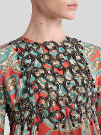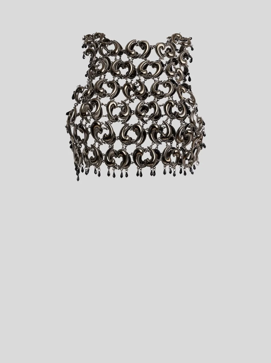 Sleeveless crop top crafted from Paisley-shaped metal elements connected by thin chains. Boasting a striking see-through effect, this design features a beaded hem. The item was presented at the Autumn-Winter 25 Runway Show. • Slim fit • Crewneck • Sleeveless • Beaded hem • Made in Italy • The model is 5' 9½" (176 cm) tall and wears a size S PRODUCT DETAILS • Paisley details: zamak and brass • Beads: acrylic