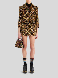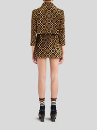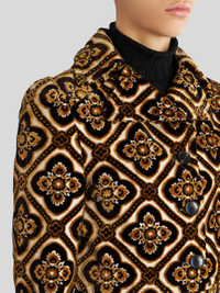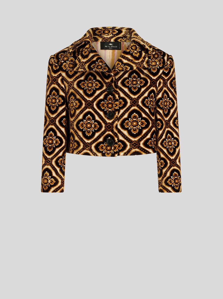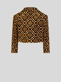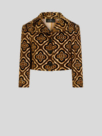 Cropped velvet jacquard jacket with maxi collar decorated by medallion patterns. Inside, the jacket has a striped jacquard lining. PRODUCT DETAILS • Exterior: 53% viscose, 47% cotton • Lining: 52% viscose, 48% acetate • Short fit • Long sleeves • Made in Italy • The model is 178 cm / 70 inches tall and wears size 40