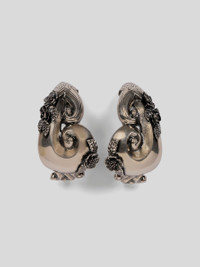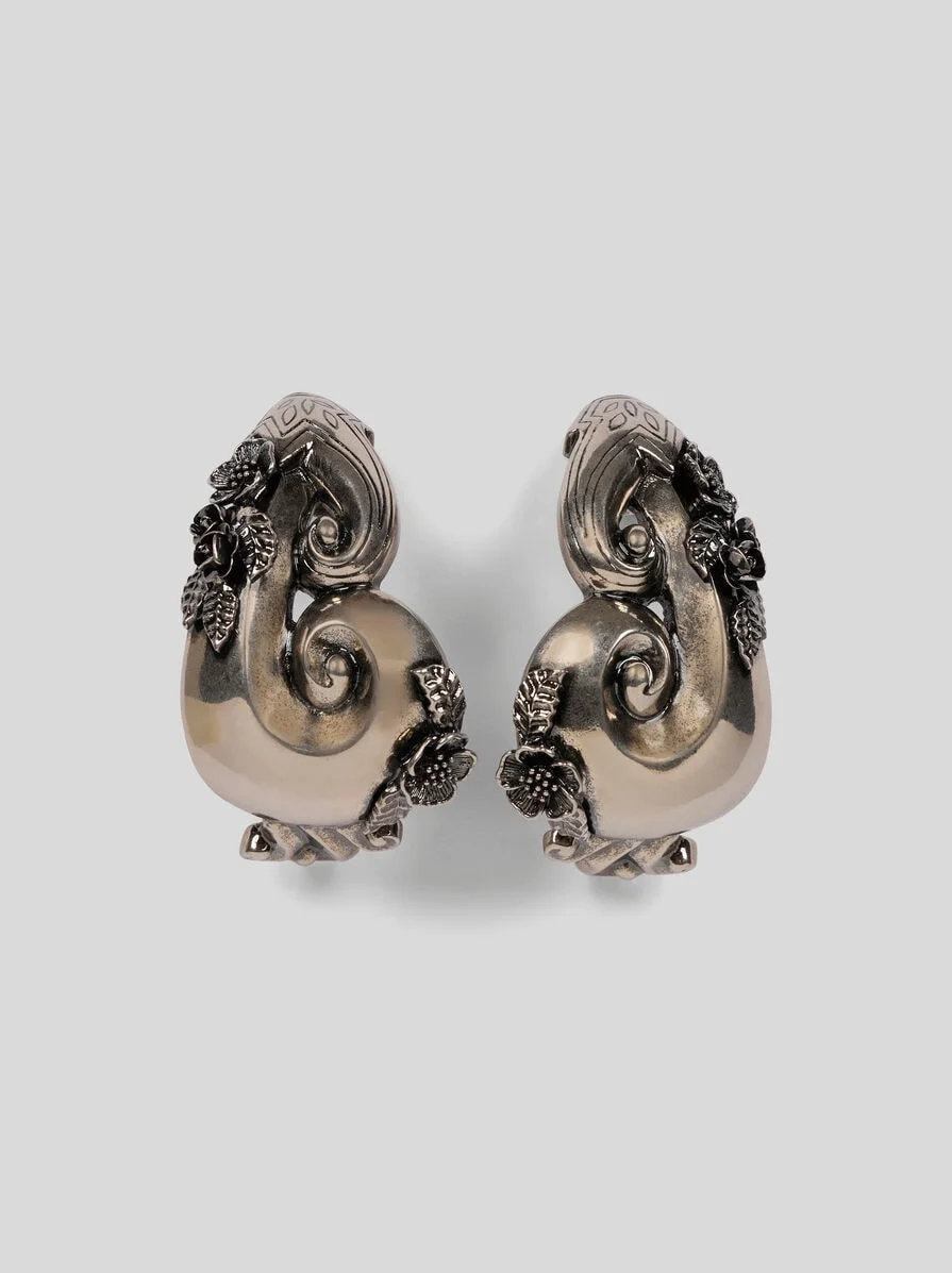 Vintage-finish brass earrings with distinctive curly shape, decorative engravings and raised flowers. • Made in Italy PRODUCT DETAILS • 100% brass